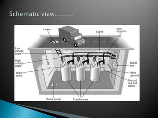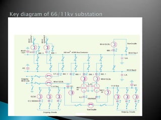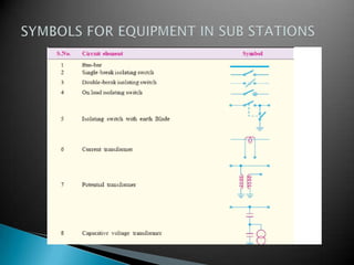 The document provides an overview of electric substations, detailing their types, functions, and constructional features, including transformer, switching, and gas-insulated substations. It emphasizes the importance of location, design considerations, and safety features for effective operation and maintenance. Additionally, it discusses various components such as bus bars, circuit breakers, and the advantages and challenges of gas-insulated systems.