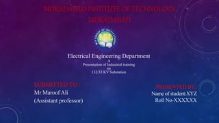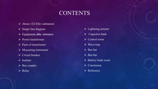 This document provides a summary of an industrial training presentation on a 132/33 kV substation. It includes sections on the single line diagram, main equipment at the substation like power transformers, circuit breakers, isolators, and protective devices. Descriptions are given for key components like transformers, measuring instruments, circuit breakers, relays, lightning arrestors, capacitor banks and the control room. The conclusion emphasizes the important role of substations in power transmission and the safety measures taken to protect them.