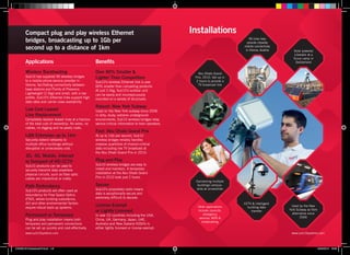 The document provides specifications for Sub10's Liberator wireless Ethernet bridges, which operate at 60GHz frequencies and can transmit data at speeds up to 1Gbps over distances up to 1km. The bridges are compact at 182x182x60mm and lightweight at 2.5kg. They use PoE for power and have an IP67 outdoor rating. Common applications include wireless backhauling, leased line replacement, LAN connectivity between buildings, and use in mobile networks and broadcast applications.