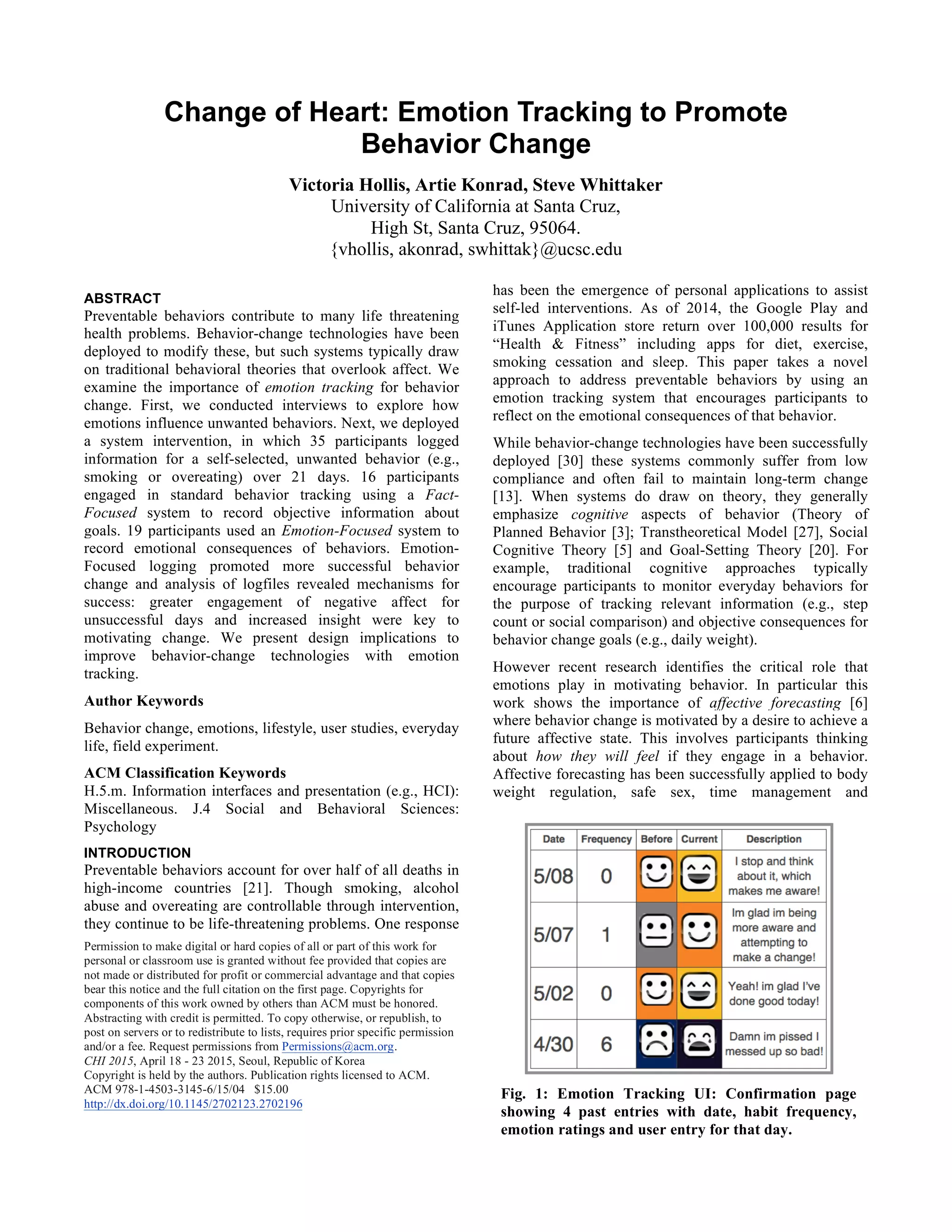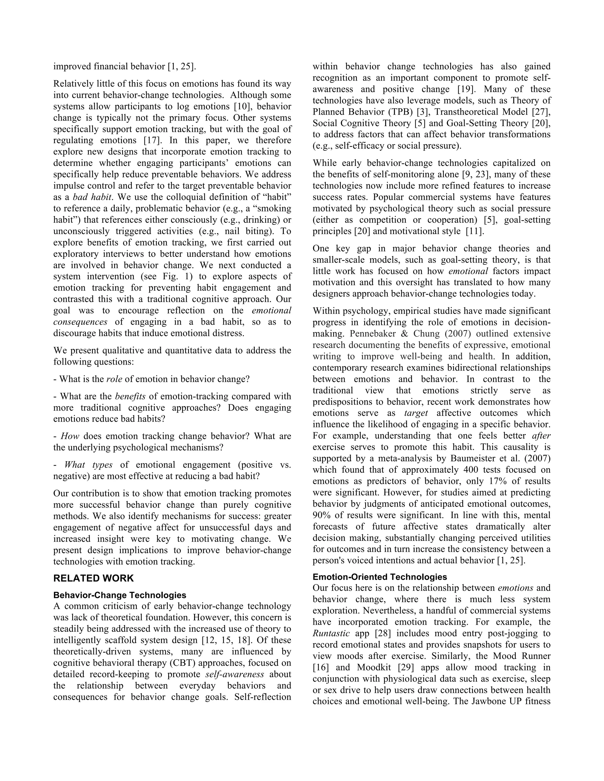 This document describes a study that examined the importance of emotion tracking for behavior change. The researchers conducted interviews to explore how emotions influence unwanted behaviors. They then deployed a system where 35 participants logged information for an unwanted behavior over 21 days. Participants using an Emotion-Focused system to record emotional consequences of behaviors showed more successful behavior change. Analysis showed greater engagement of negative affect for unsuccessful days and increased insight were key to motivating change. The study provides implications for improving behavior change technologies with emotion tracking.
