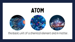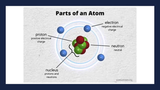 The document discusses the basic subatomic particles that make up atoms: protons are positively charged particles found in the nucleus with a mass of 1.672 x 10−24 grams, neutrons are neutral particles found in the nucleus with a mass of 1.675 x 10−24 grams, and electrons are negatively charged particles found outside the nucleus with a mass of 9.109 x 10−28 grams.