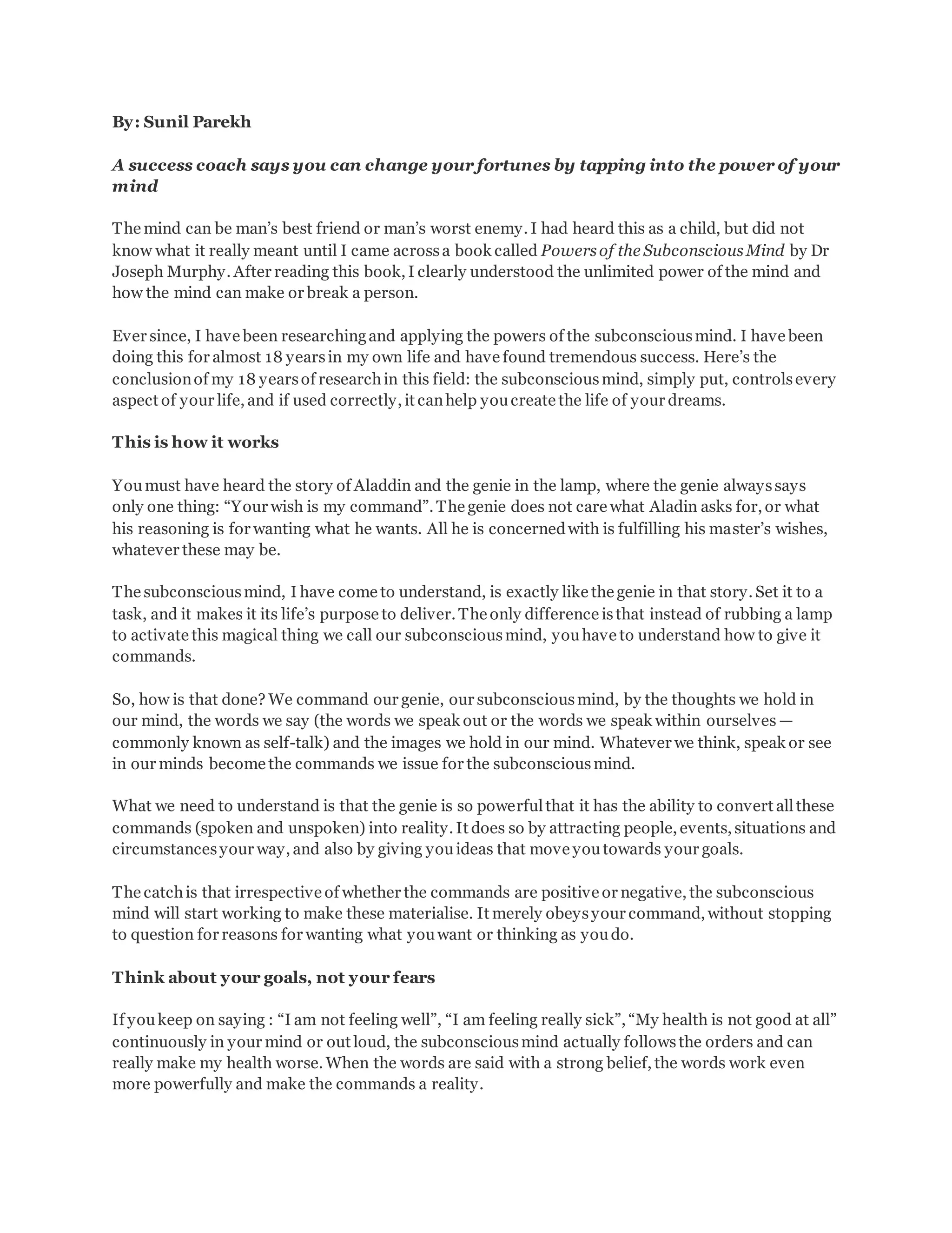 The document discusses how to use the power of the subconscious mind to achieve your goals and create the life you desire. It explains that the subconscious mind controls every aspect of your life and can help you achieve your dreams if commanded properly. A 7-step process is then outlined: 1) be clear about your goals, 2) set time-bound goals, 3) stay focused using tools like vision boards, 4) program your subconscious mind through visualization, 5) activate your subconscious, 6) take inspired and obvious actions, 7) persist through obstacles to achieve your goals.