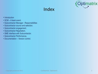 The document provides a comprehensive overview of subcontractor management, emphasizing that it is a collaborative effort involving various responsibilities and phases. It outlines the key roles of the subcontractor manager, including developing engagement and selection plans, managing performance, and ensuring effective communication and version control of documentation. Additionally, it discusses negotiation strategies and the importance of maintaining strong relationships with subcontractors to ensure successful project outcomes.