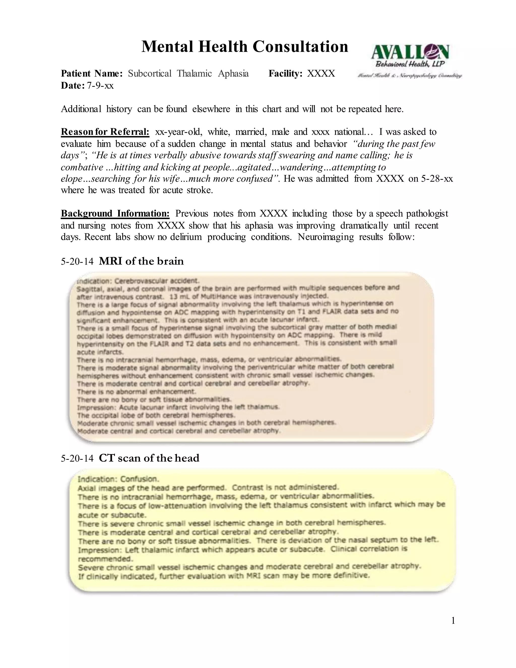 1. The patient suffered a recent left thalamic stroke and likely previous smaller strokes, leaving him vulnerable to delirium. He exhibits subcortical thalamic aphasia characterized by fluent but paraphasic speech with good repetition and mild comprehension deficits.