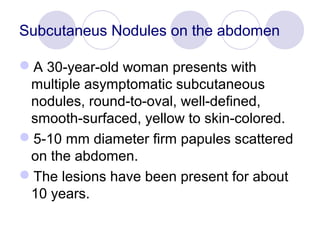 - A 70-year-old man presented with multiple asymptomatic yellow to skin-colored nodules on his scalp that had been present for 30 years.