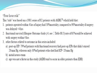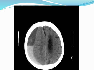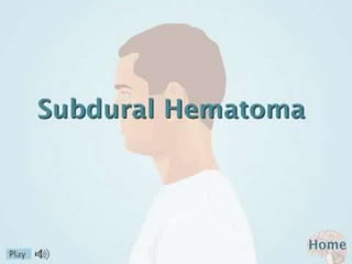 Subdural hematoma (SDH) is a blood accumulation between the skull and brain caused by high-speed impact, with varying incidence and gender ratios. Diagnosis typically involves CT or MRI scans to determine the type and stage of the hematoma, while treatment options include conservative management and surgical interventions. Complications may include increased intracranial pressure and recurrence, with prognosis varying based on the type of SDH and initial clinical state.