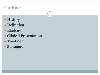 Subdural hygroma is defined as a collection of cerebrospinal fluid located under the dural membrane without blood. It is most commonly caused by trauma and presents with headaches, nausea, vomiting, or neurological deficits in adults. While often asymptomatic, it can cause mass effect and become life-threatening. Brain CT scan is used for diagnosis. Treatment involves conservative management or surgery if mass effect or unfavorable symptoms are present.