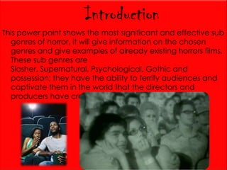 This document summarizes several subgenres of horror films, including supernatural, slasher, psychological, possession, and zombie films. It provides examples for each subgenre, such as The Conjuring for supernatural horror and Scream for slasher films. The document also discusses conventions for each subgenre, like the use of children as victims in supernatural films or the "final girl" character in slashers. Finally, it states that the author's chosen subgenre for a film project is psychological horror, as they find these films most interesting and able to grip audiences through fear and tricks.