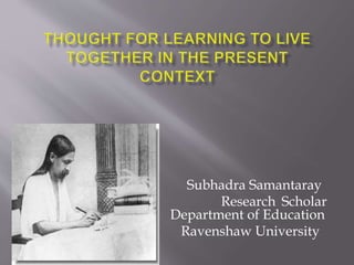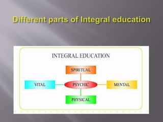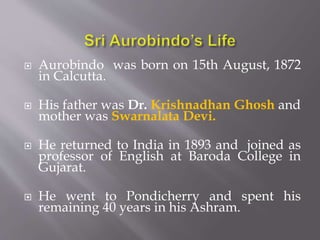 Sri Aurobindo was born in Calcutta in 1872 to Dr. Krishnadhan Ghosh and Swarnalata Devi. He returned to India in 1893 and taught English at Baroda College before moving to Pondicherry, where he spent the last 40 years of his life developing an ashram. The document discusses Sri Aurobindo's views on education, including its aim of developing the body, mind, and spirit through cultivating morality, senses, consciousness, and values while allowing the mind to grow naturally from the simple to the complex. It also describes the Sri Aurobindo International Centre of Education in Pondicherry which follows this model from kindergarten through higher education with