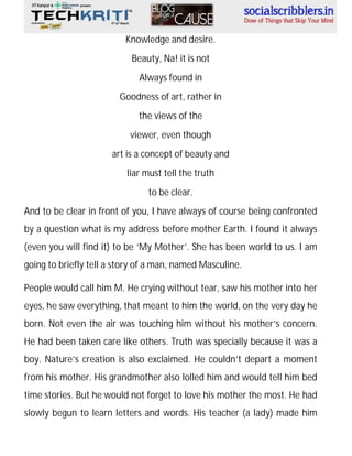 The document reflects on the profound significance of women, particularly mothers, highlighting their essential roles in life and creation. It narrates a man's journey from childhood through adulthood, illustrating his deep connection with his mother and the women in his life, including his sister and wife. Ultimately, it emphasizes the need to respect and cherish women as the foundational force of nature and existence.