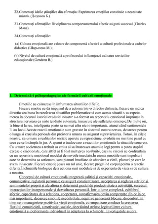 Documentul prezintă subiecte esențiale pentru examenul de psihologie a emoțiilor, abordând conceptul de cultură emoțională și importanța dezvoltării afective în formarea personalității. Se evidențiază rolul emoțiilor în influențarea gândirii și comportamentului, precum și nevoia de a gestiona corect trăirile emoționale pentru sănătatea mentală. De asemenea, se discută despre competențele emoționale necesare educatorilor și impactul acestora asupra calității educației.