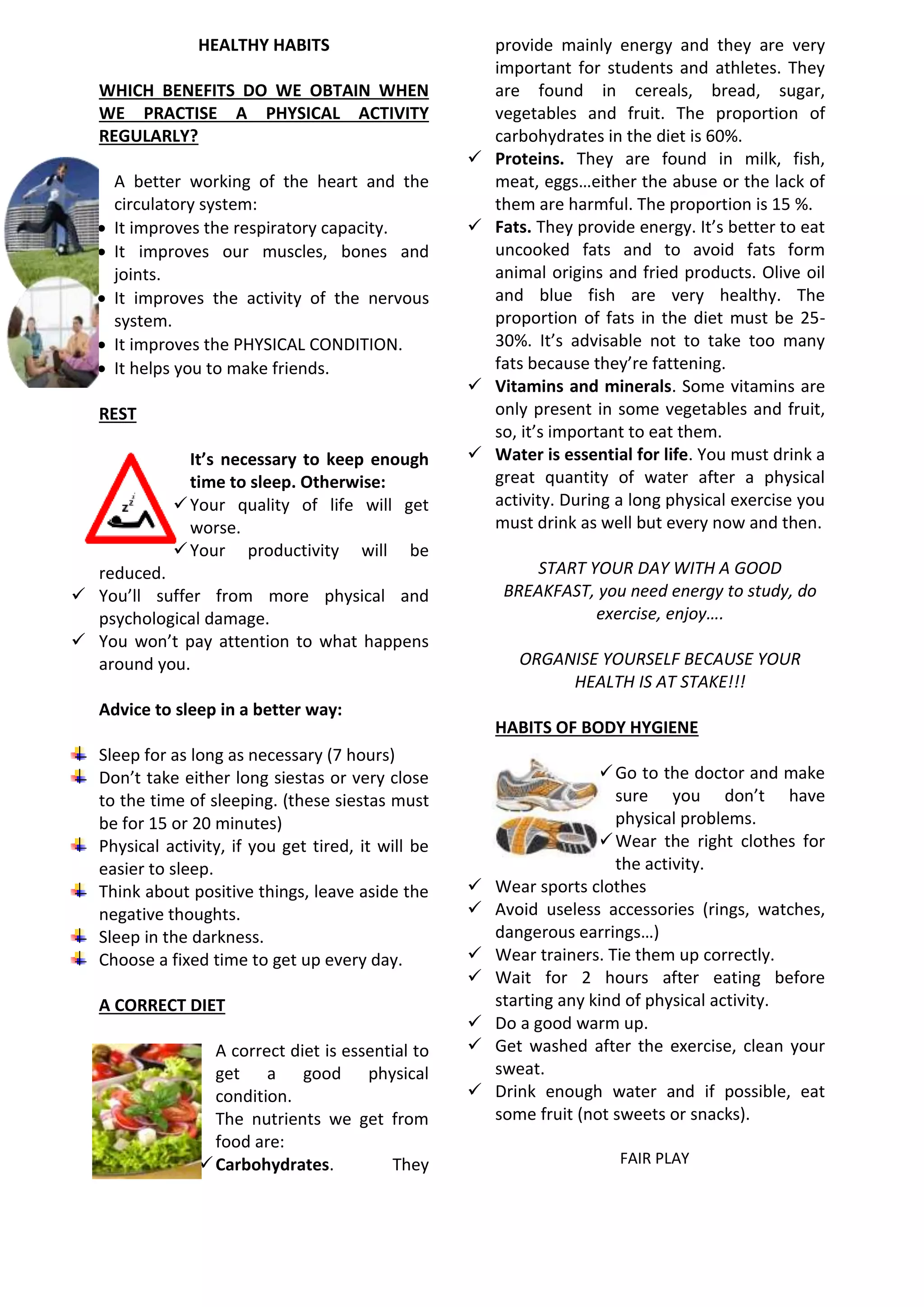 Regular physical activity provides numerous benefits, including improved cardiovascular health, respiratory capacity, muscles, bones, joints, nervous system, and physical condition. It also helps people make friends. Proper rest is important, as getting insufficient sleep can reduce quality of life, productivity, and increase physical and psychological problems. A balanced diet containing carbohydrates, proteins, fats, vitamins, minerals, and water supports overall health and physical performance. Maintaining healthy habits through exercise, nutrition, hygiene, and rest is key to well-being.