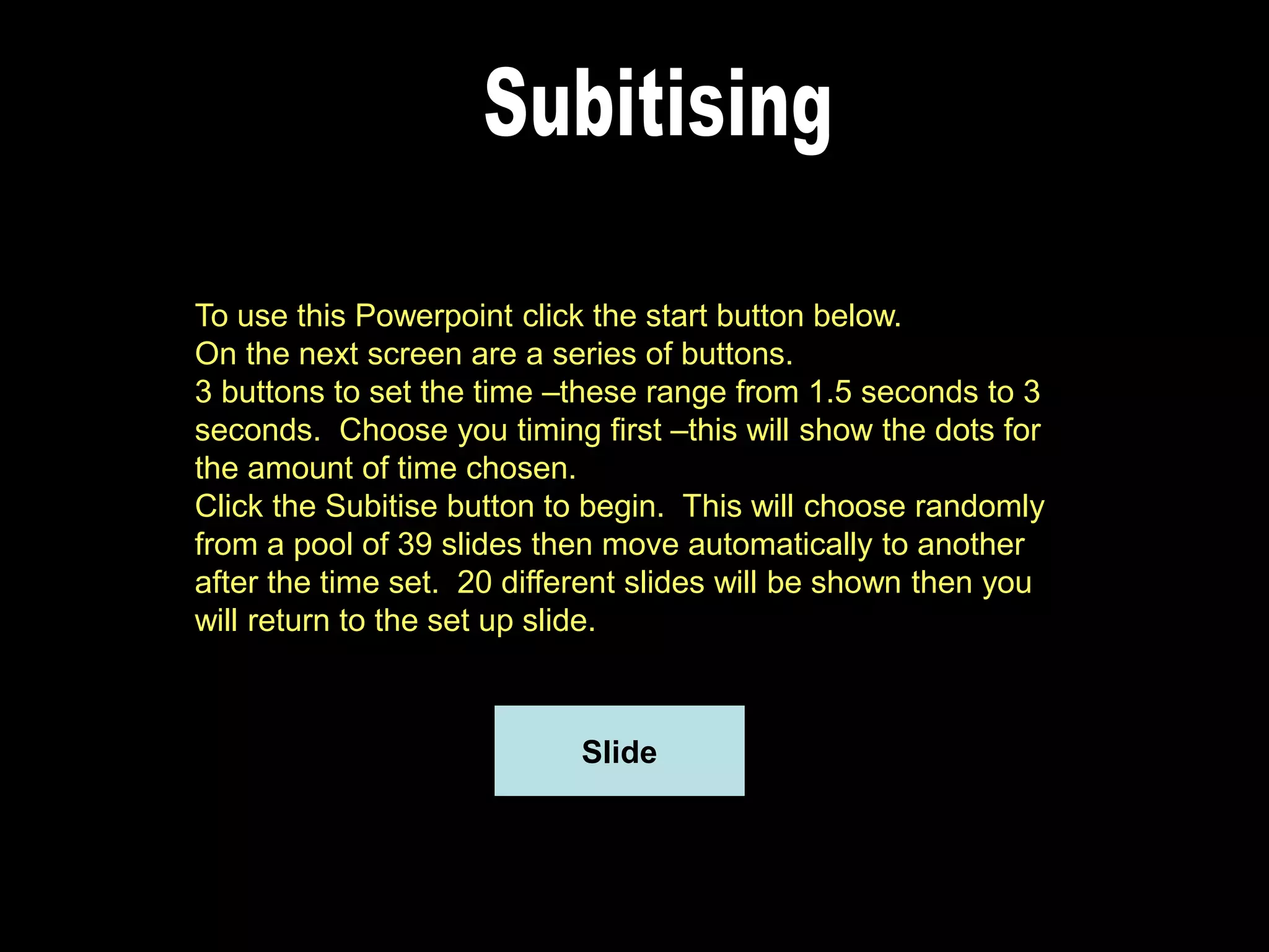 This PowerPoint presentation contains instructions for a subitizing activity. The user is instructed to click the start button to begin, then select a time between 1.5 and 3 seconds using the provided buttons. After choosing the timing, the user clicks "Subitize" to begin the activity, where random slides will be displayed for the set duration before automatically advancing to the next. The activity contains 20 different slides total.