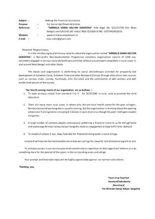 This document is a request for financial assistance from the Nirmala Samaj Kalyan Sangstha, a non-profit organization in West Bengal, India. The organization consists of 1300 volunteers engaged in social and philanthropic activities to help underprivileged communities. They operate primary schools, health centers, old age homes and orphanages. However, they lack necessary grants and funding to fully achieve their mission. They are seeking the recipient's consent, cooperation and financial support to help expand their important social work for underserved groups.