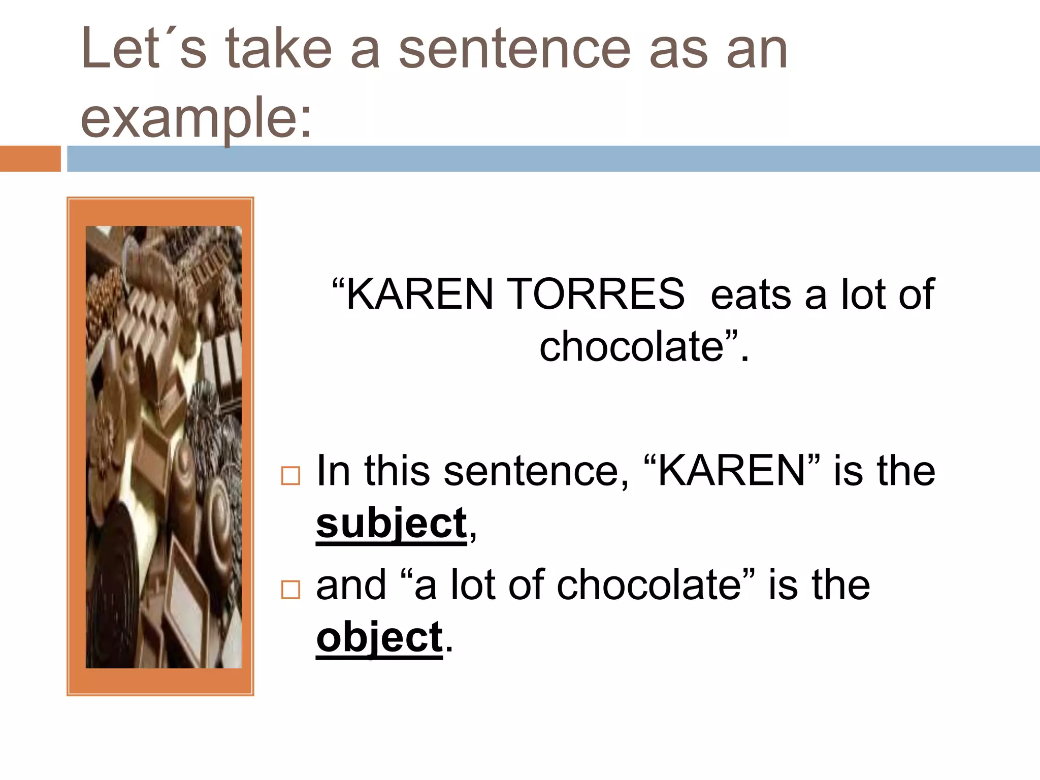 This document discusses subject and object questions in sentences. It provides examples of sentences and questions that identify either the subject or object. For the sentence "KAREN TORRES eats a lot of chocolate", a subject question would be "Who eats a lot of chocolate?" and an object question would be "What does KAREN eat?". It also discusses forming questions in the present and past tenses and provides additional examples of subject and object questions.