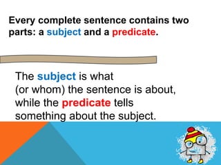 This document provides a grammar lesson for third grade students on identifying subjects and predicates in sentences. It explains that every complete sentence has both a subject, which is who or what the sentence is about, and a predicate, which tells something about the subject. It gives examples of subjects and predicates, and discusses compound subjects and predicates which contain more than one subject or predicate joined by conjunctions like "and" or "or".