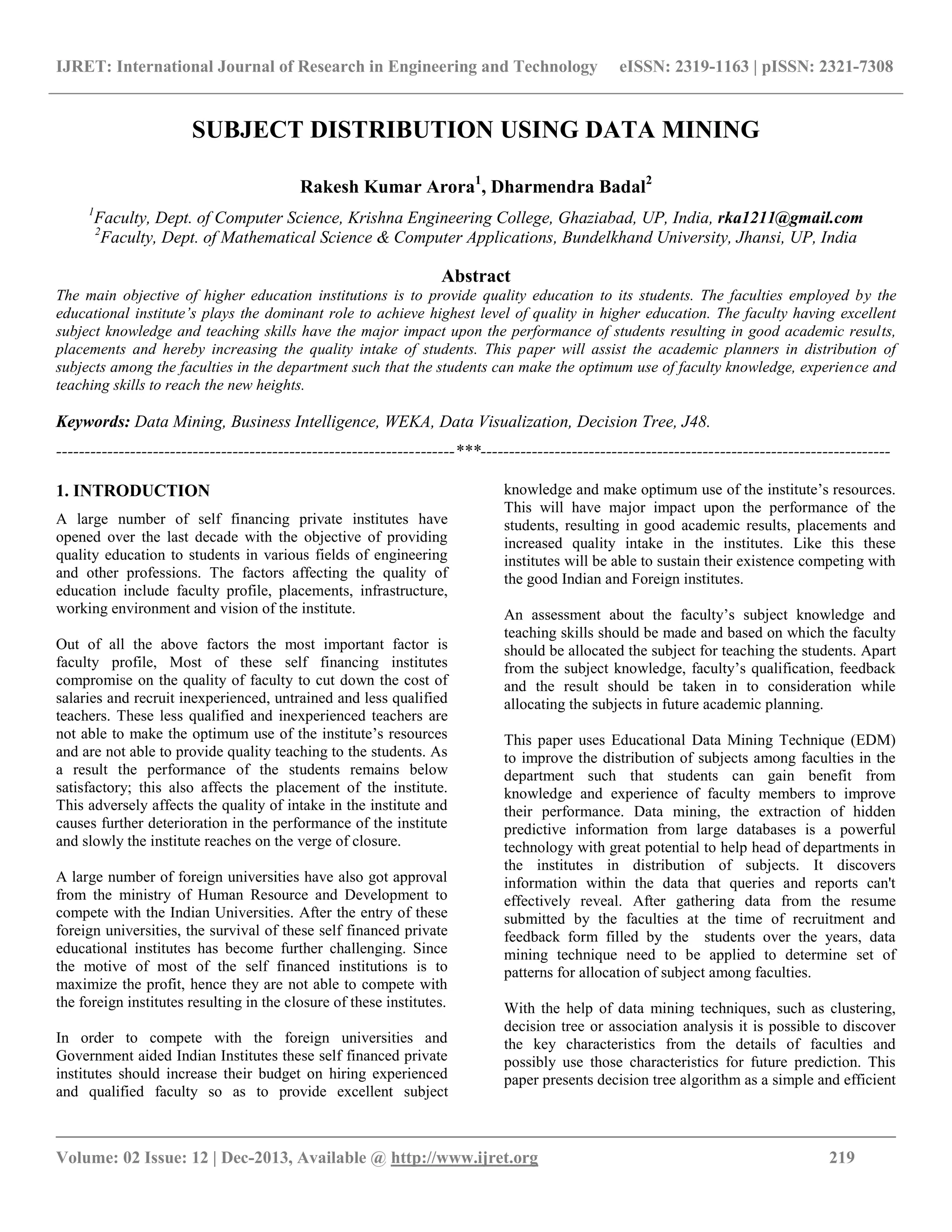 The document discusses the importance of faculty in higher education institutions and proposes using educational data mining techniques, particularly the decision tree algorithm, to optimize subject distribution among faculties to improve student performance. It highlights the adverse effects of low-quality faculty on student outcomes and the competitiveness of self-financed institutes against foreign universities. The study presents a methodology using the Weka tool for analyzing faculty attributes and recommends strategies for effective faculty assignment to enhance educational quality and placement success.