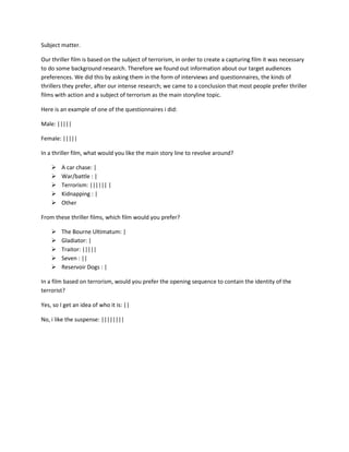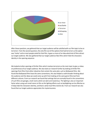 The thriller film focuses on terrorism as the main storyline, supported by extensive audience research through interviews and questionnaires that reveal preferences for action and suspense in thrillers. The study indicates that viewers enjoy films that keep characters' identities concealed in the opening sequence and appreciate settings that enhance mystery. Additionally, analyzing similar films from various cultures, like Bollywood, helped inform creative decisions regarding the film's conventions and visual aesthetics.