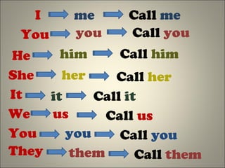This document provides a list of subject and object pronouns in English. It includes first, second and third person singular and plural pronouns such as I, you, he, she, it, we, they as well as the object forms of these pronouns like me, him, her, them. The document also lists examples of using these pronouns in the phrase "Call [pronoun]".
