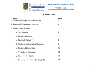 The document provides information about subject options for students at Teck Whye Secondary School for the 2011-2012 school year. It includes details about pure science subjects like Chemistry, Biology and Physics, as well as combined science, additional mathematics, combined humanities, and principles of accounts. The timeline, criteria and benefits of each subject are described, along with the relevant subject teachers and their contact information.
