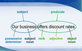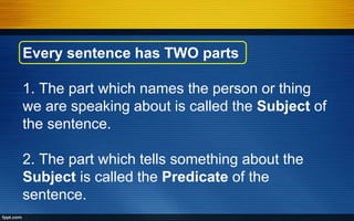 Every sentence has two parts: the subject, which names the person or thing being spoken about, and the predicate, which tells something about the subject. While the subject usually comes first, it can occasionally come after the predicate. In imperative sentences, the subject is left out but understood to be "you". A sentence needs both a subject to speak about and a predicate to say something about that subject.