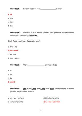 The document contains 15 multiple choice questions about English grammar concepts related to subject/object pronouns, the verb "to be" in affirmative, negative and interrogative forms, and the present continuous tense. The questions test knowledge of pronoun usage, conjugations of "to be", formation of the present continuous (adding "-ing"), and identifying examples that demonstrate these grammar rules correctly.