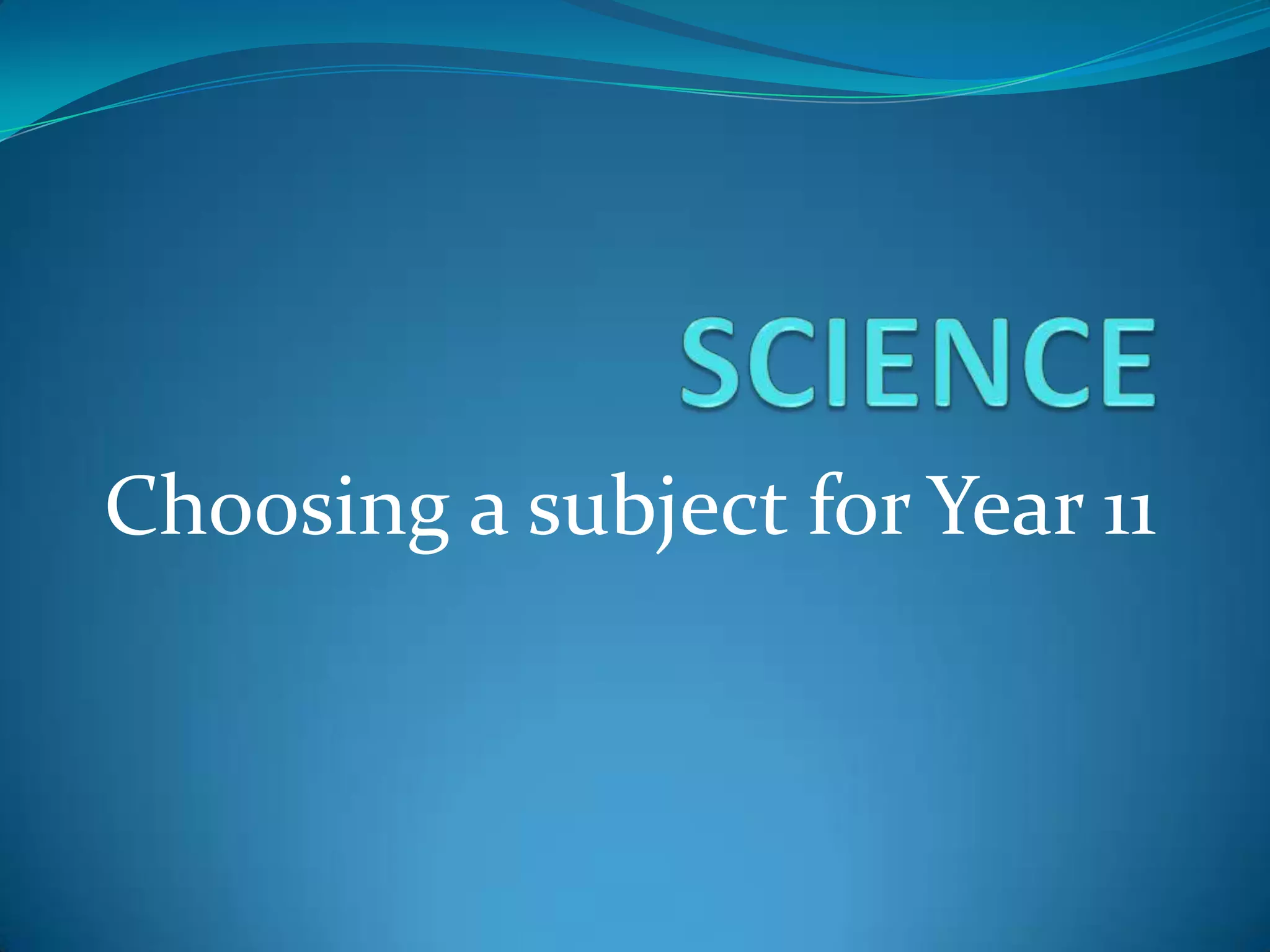 There are four science subjects offered for Year 11 students to choose from: Biology, Chemistry, Physics, and Senior Science. Each subject is worth 2 units and can contribute to a student's ATAR. Biology requires strong literacy skills, Chemistry requires good problem solving and mathematical abilities, and Physics requires excellent math and problem solving skills. The document recommends students discuss the options with their science teacher to determine the best fit for their interests and academic level.