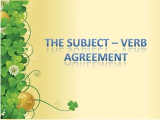 The document discusses subject-verb agreement rules in English. It provides examples of when to use singular verbs (ending in "s") versus plural verbs (not ending in "s") depending on whether the subject is singular or plural. Key factors that determine the verb form include whether the subject is a singular or plural noun, the number of the subject noun, and prepositional phrases or compound subjects that do not affect the singularity of the verb.
