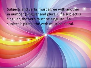 This document discusses subject-verb agreement and the rules for matching verbs with singular and plural subjects. It notes that singular subjects require singular verbs, while plural subjects require plural verbs. Examples are provided showing how verbs change from their singular to plural forms depending on whether the subject is singular or plural. The document also discusses how group nouns can be either singular or plural depending on whether the group is viewed as a whole or as individuals. Finally, it addresses some nouns that end in "s" but are still singular, requiring a singular verb.