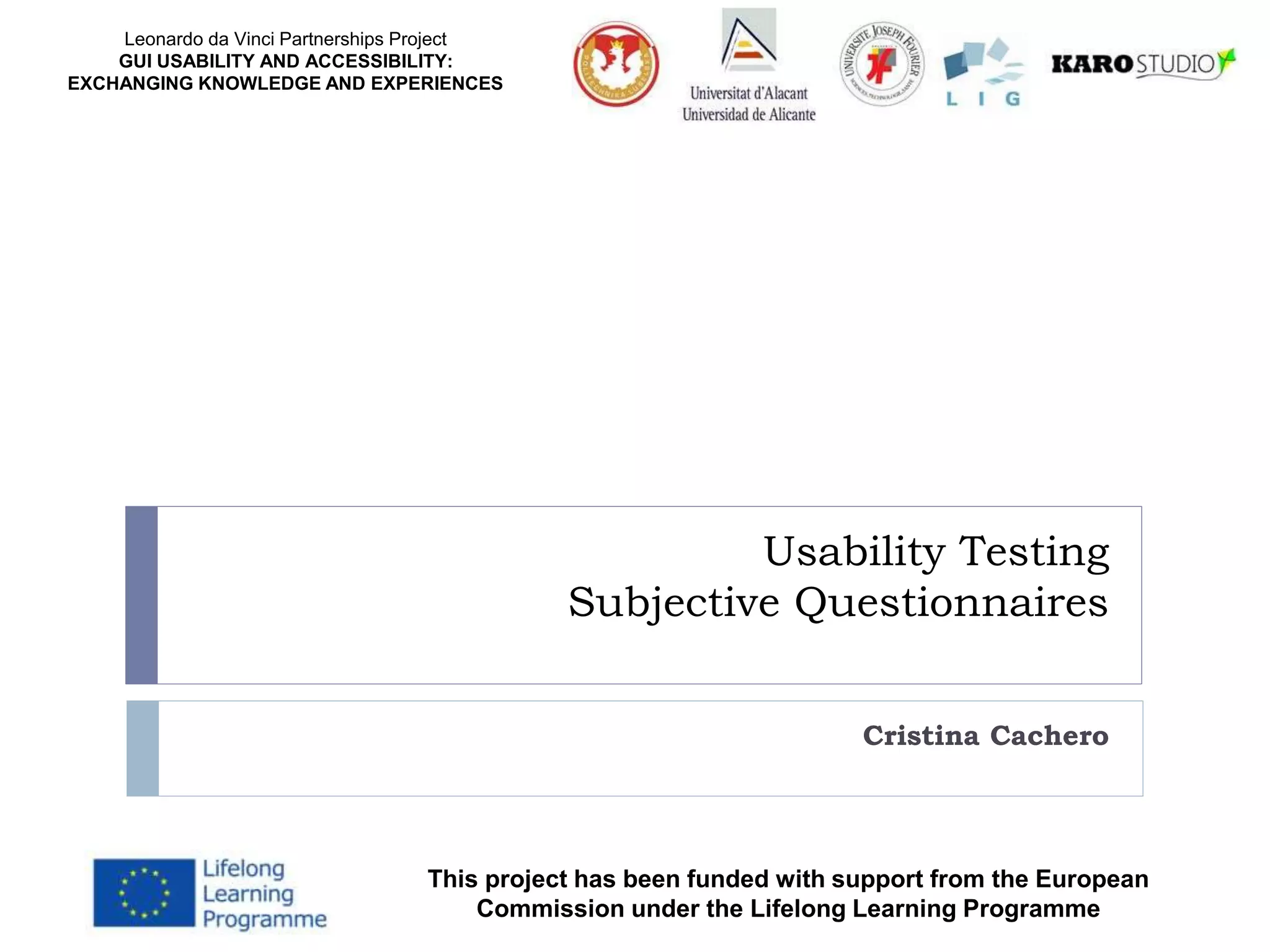 This document discusses different types of subjective questionnaires that can be used to evaluate user experience during usability testing. It describes test-level questionnaires that are administered after all tasks are completed, including the CSUQ, PSSUQ, QUIS, EUCS, and USE questionnaires. It also discusses the widely used SUS (System Usability Scale) and Net Promoter Score questionnaires. The document provides details on how to administer and score the SUS questionnaire and defines threshold values for SUS scores. It recommends obtaining a SUS score greater than 80 to be confident in a system's usability.