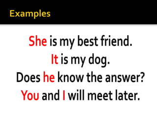 This document discusses subject and object pronouns. It explains that subject pronouns are used as the subject of a sentence in place of a name, after the subject has already been introduced. It is the "doer" of the action. Object pronouns are pronouns that receive the action of the verb in a sentence. It is the "receiver" of the action. The document then provides tables listing the singular and plural forms of subject and object pronouns.