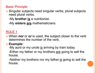 This document outlines 10 rules for subject-verb agreement in English. It explains that singular subjects require singular verbs and plural subjects require plural verbs. It provides examples for when compound subjects connected with "or", "nor", "either", or "neither" determine singular or plural verbs. Pronouns like "each", "everyone", and "somebody" are singular while collective nouns can be either singular or plural depending on their use. The number and proximity of the subject to the verb determines its number.