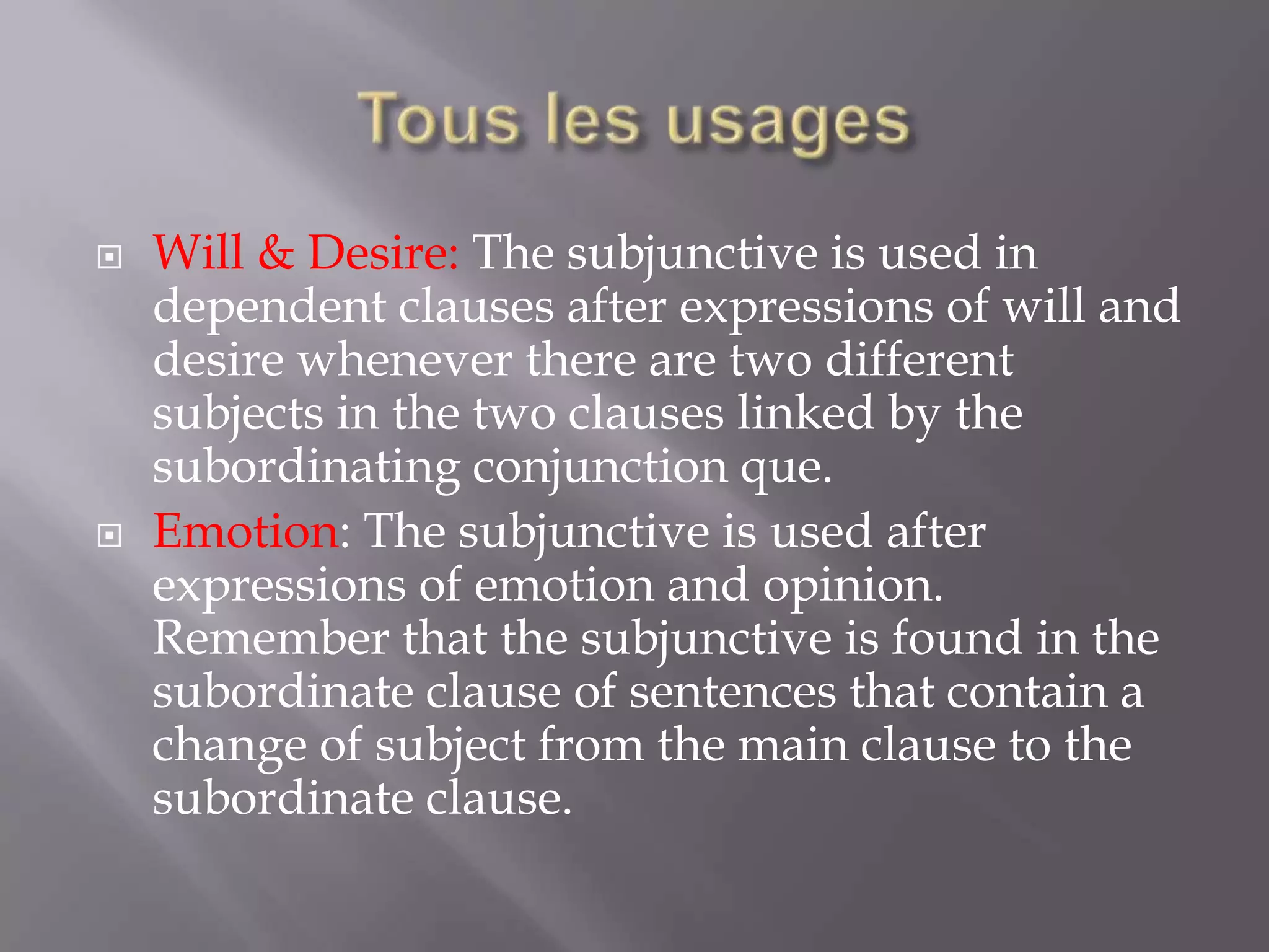 The document discusses the use of the subjunctive mood in French. It states that the subjunctive is used in subordinate clauses after expressions of will, desire, emotion, and opinion, whenever there is a change in subject between the main and subordinate clauses. It provides examples of expressions that trigger the subjunctive, including expressions of will, preference, emotion, opinion, and more. The document also provides example sentences using these expressions and the subjunctive.