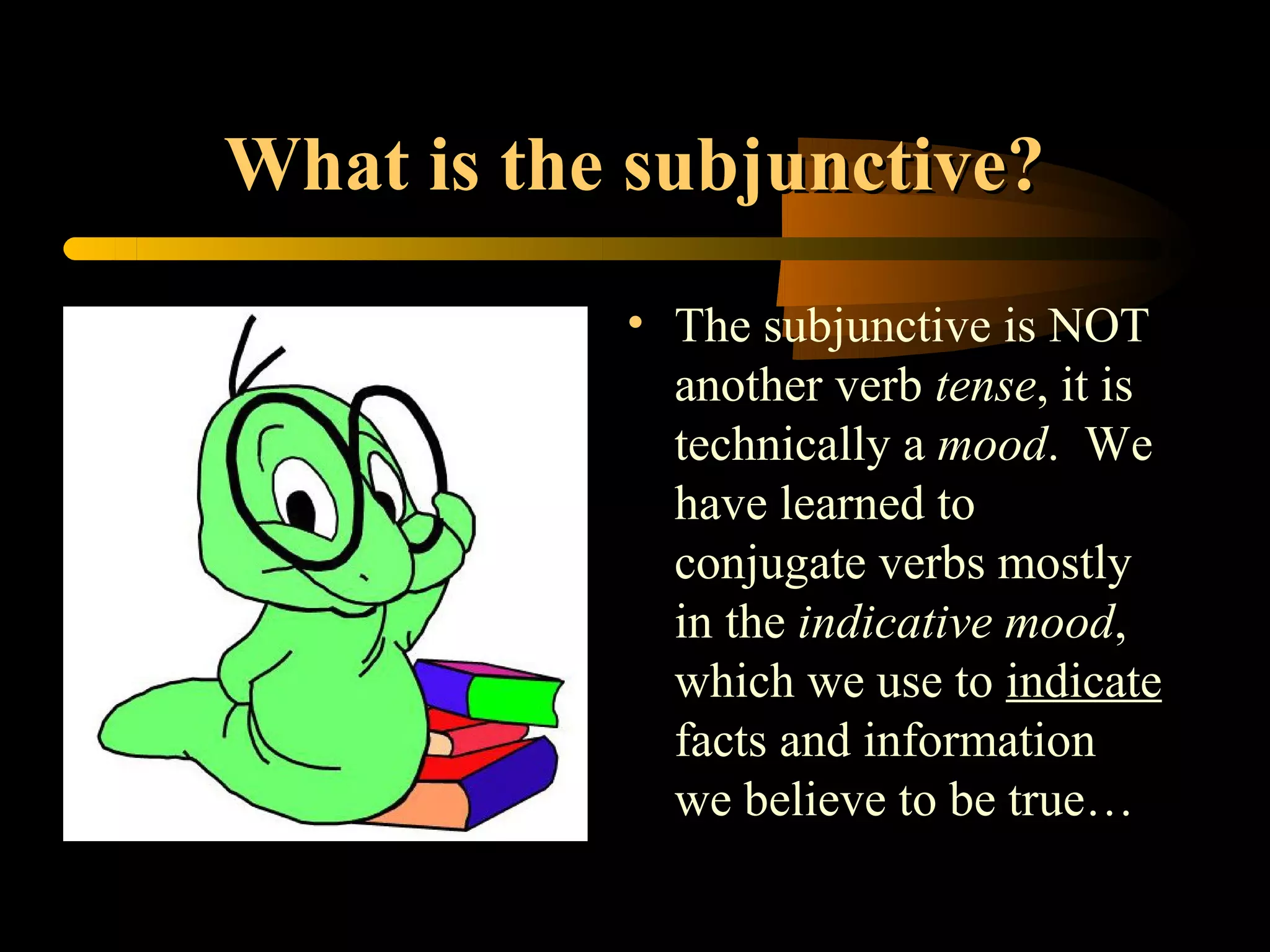 The document discusses the subjunctive mood in Spanish. It begins by explaining that the subjunctive is not a verb tense but rather a mood used to indicate uncertainty or opinions that influence actions. It provides examples of how the subjunctive is used after verbs expressing wants, desires, hopes, and orders. It then explains how to conjugate verbs into the subjunctive and provides an acronym to summarize the major uses of the subjunctive mood.