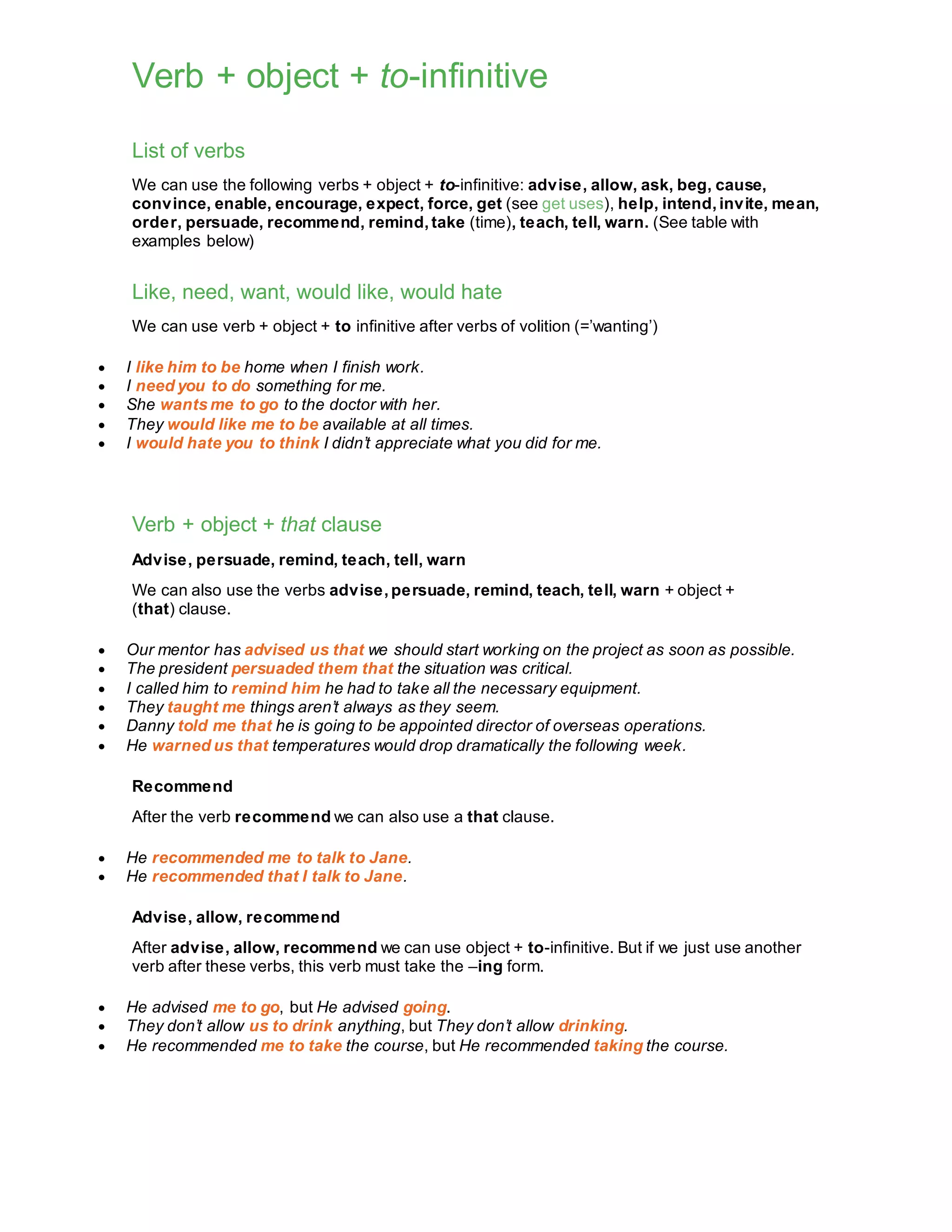 The document provides information on different verb constructions that can follow certain verbs in English. It lists verbs that can be followed by an object and a to-infinitive structure, such as "advise, allow, ask." It also discusses verbs that can take an object and an -ing verb, such as "dislike, hate, imagine." The document provides examples of these different structures and includes practice exercises.