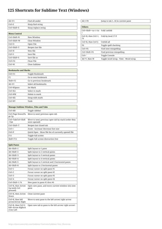 This document lists 125 keyboard shortcuts for the Sublime Text editor on Windows. It covers shortcuts for navigation, selections, text manipulation, undo/redo, cut/copy/paste, find and replace, menu control, bookmarks, managing windows/tabs/files, splitting panes, and other functions like spell checking and toggling the console. Many common shortcuts like Ctrl+S to save or Ctrl+C to copy are included.