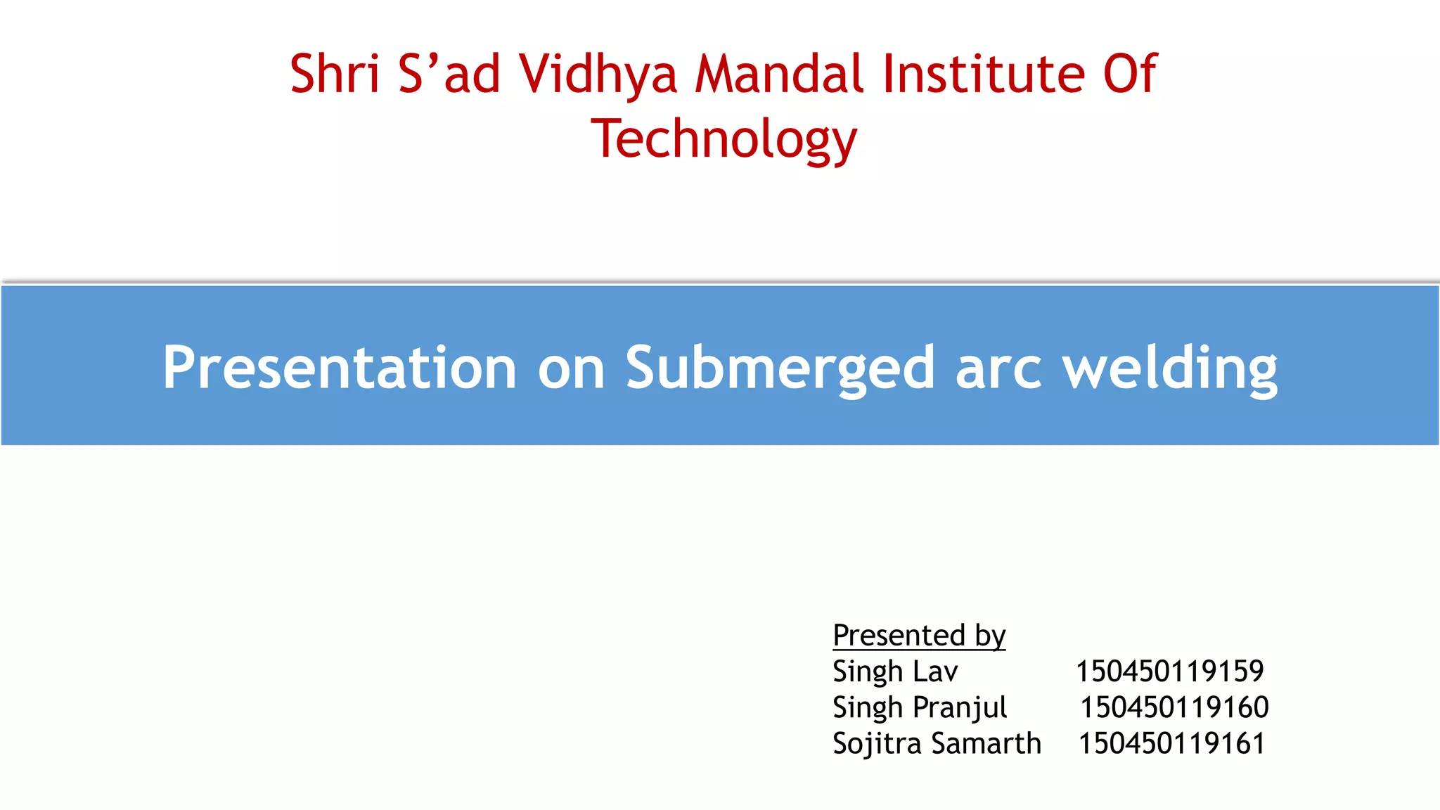 This document provides information about submerged arc welding. It discusses that submerged arc welding involves melting and fusing metals with an electric arc under a blanket of granular flux. The flux protects the weld from impurities and oxygen in the air. It allows for high welding speeds, deep penetration, and produces high quality welds suitable for joining metals like steel. Some key equipment used includes a wire feeder, welding power source, and an arrangement for holding the flux. Submerged arc welding is commonly used in industries like automotive, aviation, shipbuilding, and nuclear power.