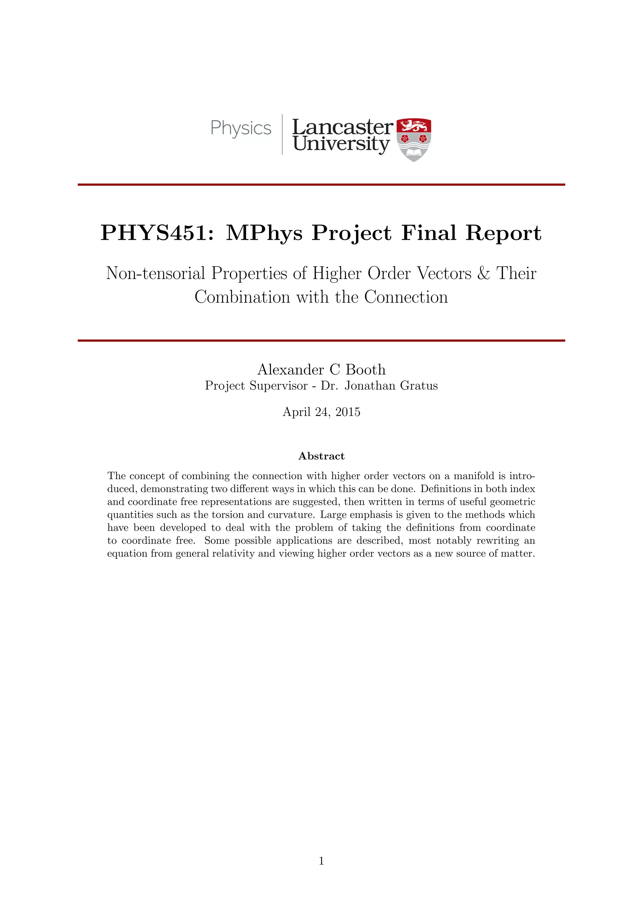 This document is a physics project final report that introduces the concept of combining higher order vectors and the connection on a manifold. It defines higher order vectors up to arbitrary order using both index and coordinate-free representations. It then investigates how higher order vectors and the connection transform between coordinate systems. Finally, it suggests two ways of combining second and third order vectors with the connection and shows how this naturally introduces the torsion and curvature of the manifold. The report emphasizes developing coordinate-free definitions and discusses potential applications, such as rewriting equations from general relativity by viewing higher order vectors as a new source of matter.