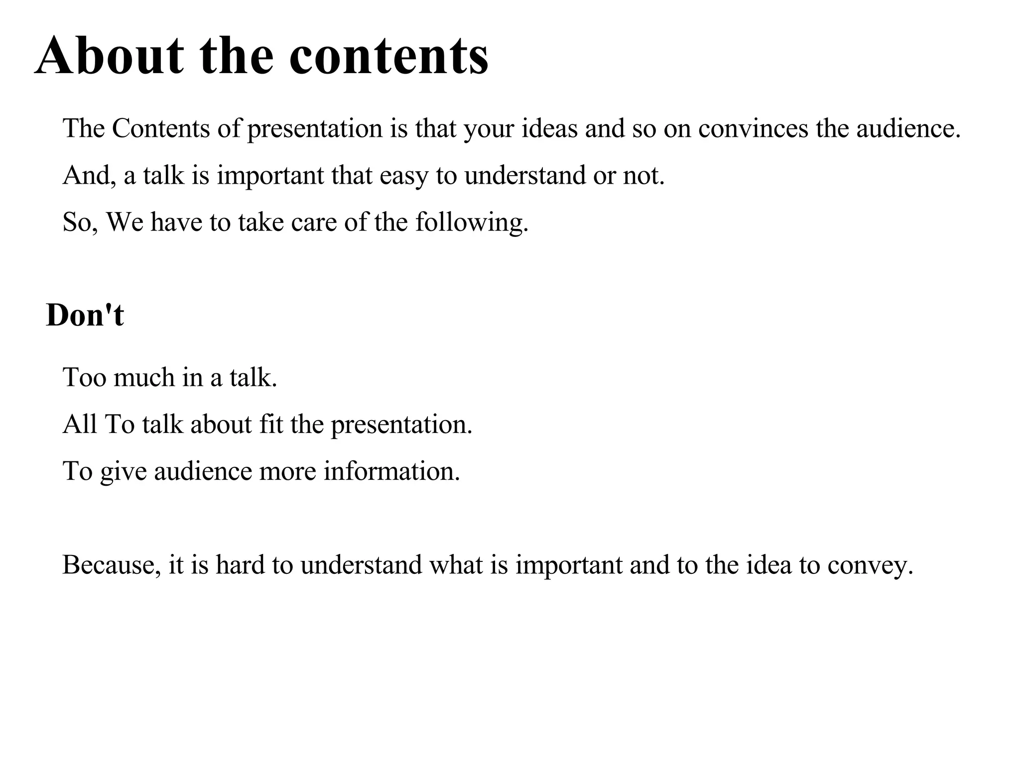 The document provides recommendations for creating effective presentations, including keeping slides simple with descriptive titles and limited text, using figures and examples to engage audiences, and practicing talks and answering questions to improve delivery and preparedness for questions. Key points are to focus on important information, use visual aids appropriately, make eye contact, and give yourself time to think before answering questions.