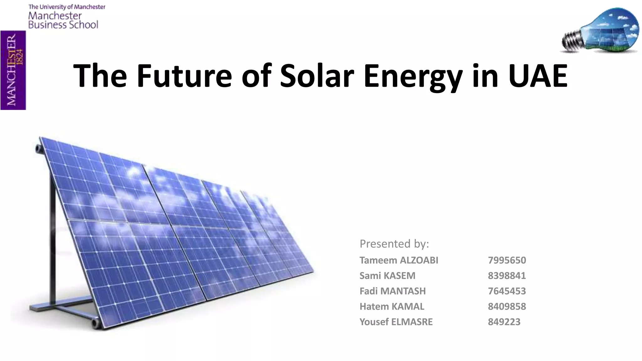 The document summarizes research on the future of solar energy in the UAE. It analyzes the country's regulatory, environmental, infrastructure, cultural, and economic factors using a PESTLE framework. Primary research with consumers found high interest in solar energy due to cost savings but identified high costs as a barrier. Interviews revealed solar is disruptive but cheap oil gives the government time and fracking poses a threat. The research concludes solar has potential in UAE if policies support public investment and subsidies while increasing eco-awareness and privatizing utilities.