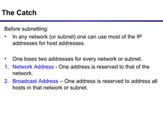 This document discusses subnetting and provides an example of subnetting the network address 172.19.0.0/16 into subnets with mask 255.255.255.0 (/24). It shows how the network is divided into multiple subnets, each with 254 usable host addresses. It also explains some key points about subnetting such as reserving the network and broadcast addresses in each subnet and how subnetting does not increase the number of available hosts but allows dividing a network into smaller networks.