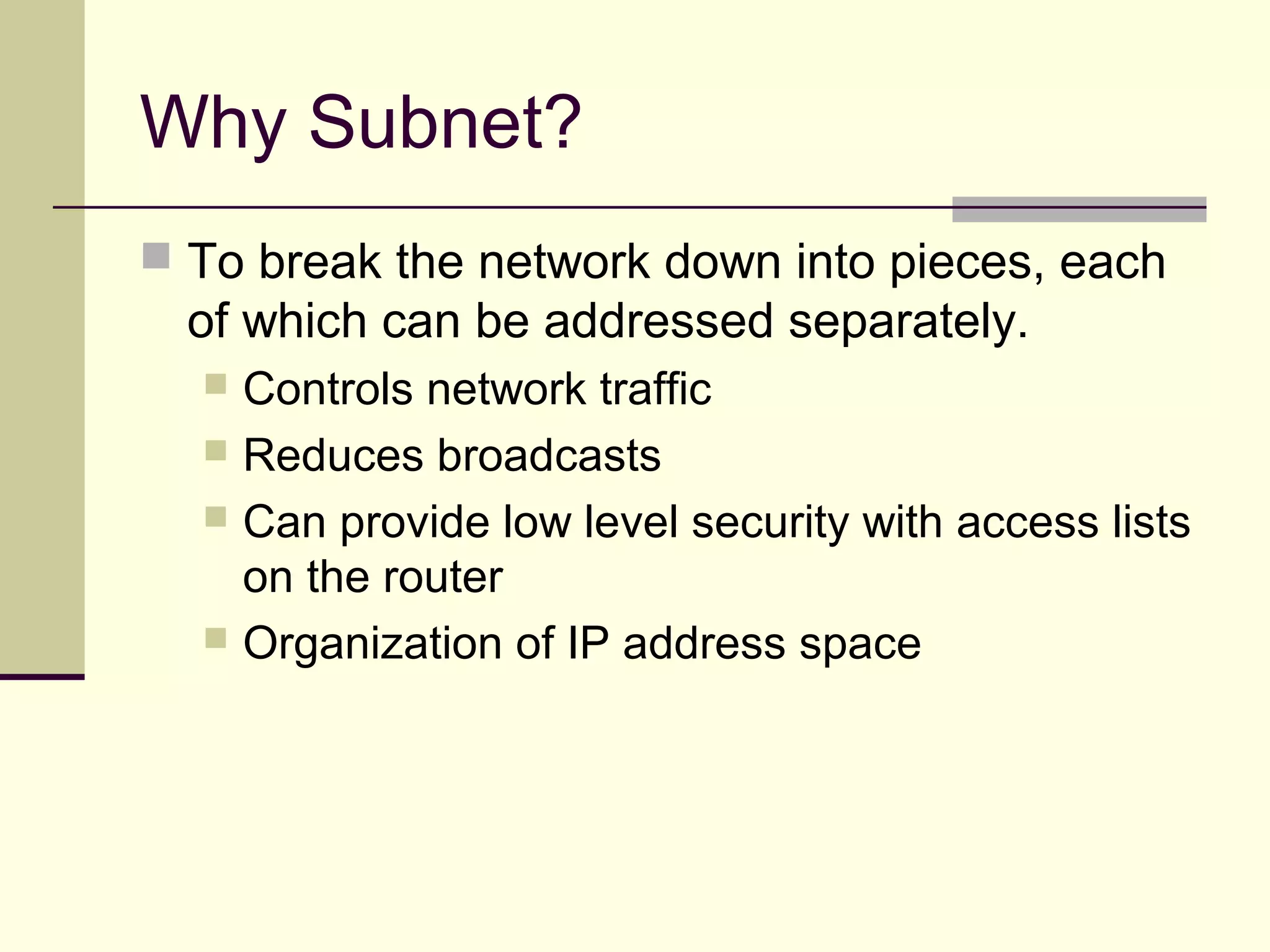 The document discusses subnetting by borrowing bits from the host portion of a default class C or class B IP address to create subnets, with examples showing how to determine the number of bits to borrow to get a desired number of subnets, and how this partitioning yields a specific number of usable subnets and hosts per subnet along with their IP ranges and subnet mask. It provides step-by-step explanations for subnetting sample class C and class B networks, determining subnet and host bit locations and quantities.