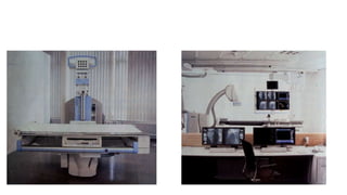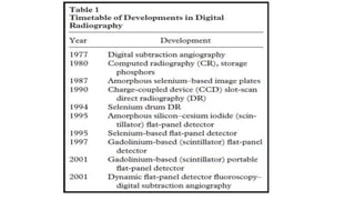 The document discusses the components and functioning of conventional fluoroscopy, digital fluoroscopy, and digital subtraction angiography (DSA). It describes the key components of an image intensifier tube used in conventional fluoroscopy including the glass envelope, input phosphor, photocathode, electrostatic focusing lens, and output phosphor. Digital fluoroscopy systems use a charge-coupled device (CCD) instead of a television camera and can acquire images faster with less radiation exposure to the patient. Flat panel detectors are now also used as alternatives to image intensifier tubes.