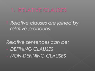 The document outlines the use of relative clauses and linkers in English grammar. It explains the distinction between defining and non-defining clauses, the appropriate relative pronouns to use, and various linkers for expressing purpose, cause, and contrast. Additionally, it provides examples to illustrate how these grammatical structures function in sentences.