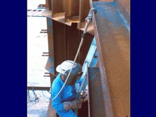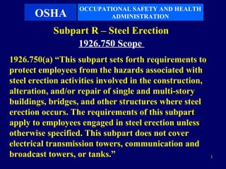 This document outlines Occupational Safety and Health Administration (OSHA) regulations regarding steel erection safety. It covers requirements for steel erection activities, hoisting and rigging, structural steel assembly, and metal decking. Employers must ensure concrete strength before erection begins, provide adequate site layout and access, inspect cranes daily, and not work under suspended loads unless absolutely necessary. On multi-story structures, floors must be installed as erection progresses, with no more than 8 stories or 4 floors of unfinished bolting or welding unsecured above.