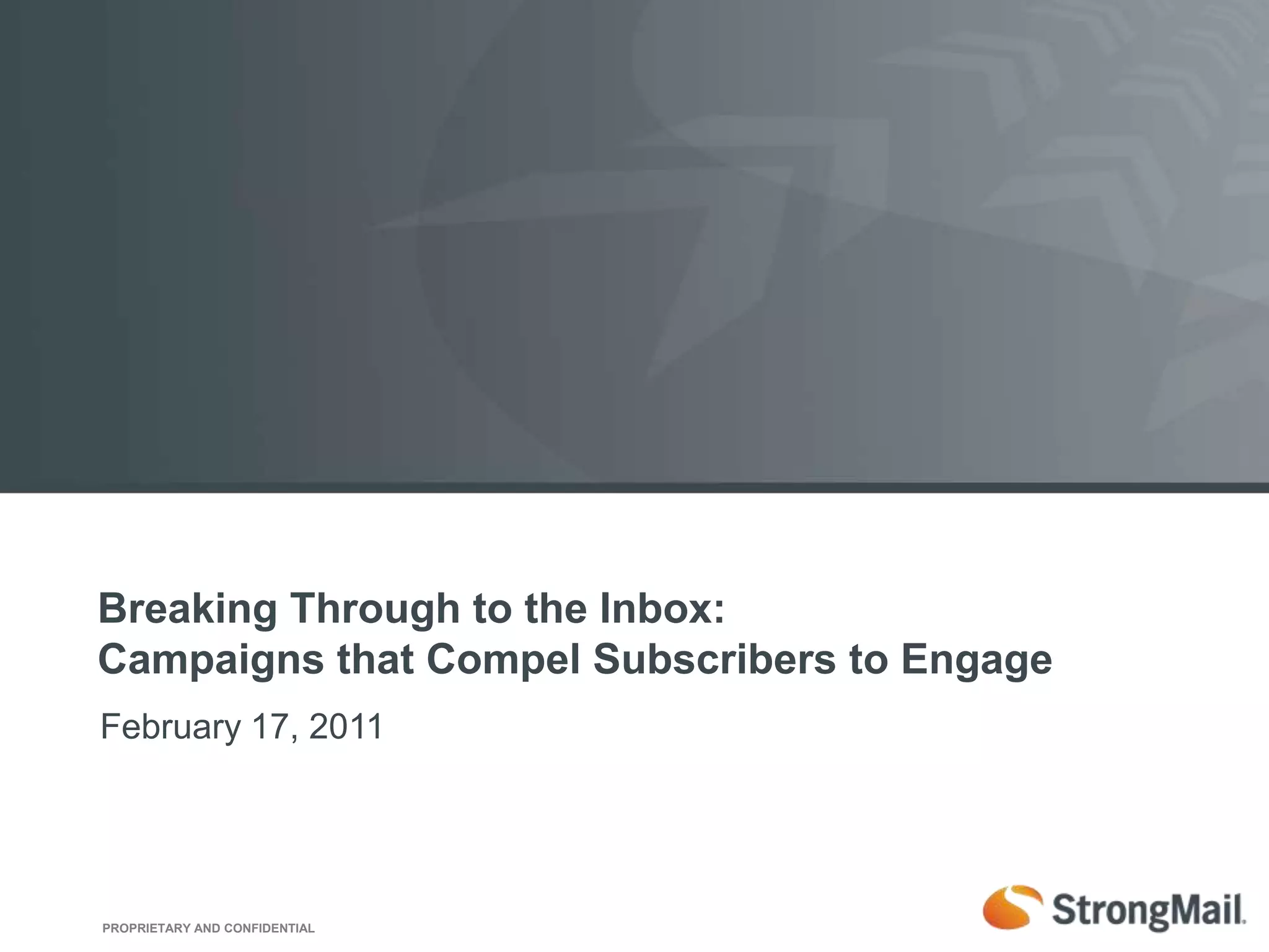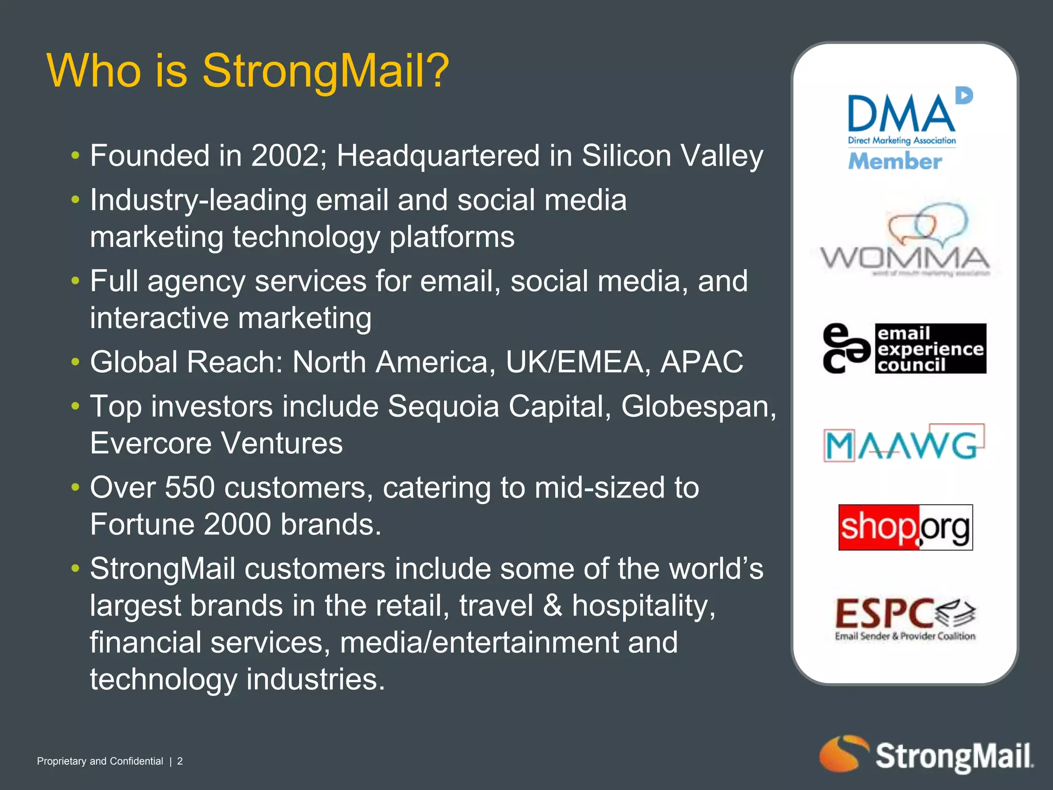 StrongMail, established in 2002, is an email and social media marketing technology company with a global reach and a client base that includes prominent brands across various industries. The document outlines strategies for increasing subscriber engagement, emphasizing the importance of segmentation, social media integration, and interactive content to enhance the email marketing experience. It also discusses innovative tactics such as mystery coupons and personalized offers to optimize customer engagement and retention.