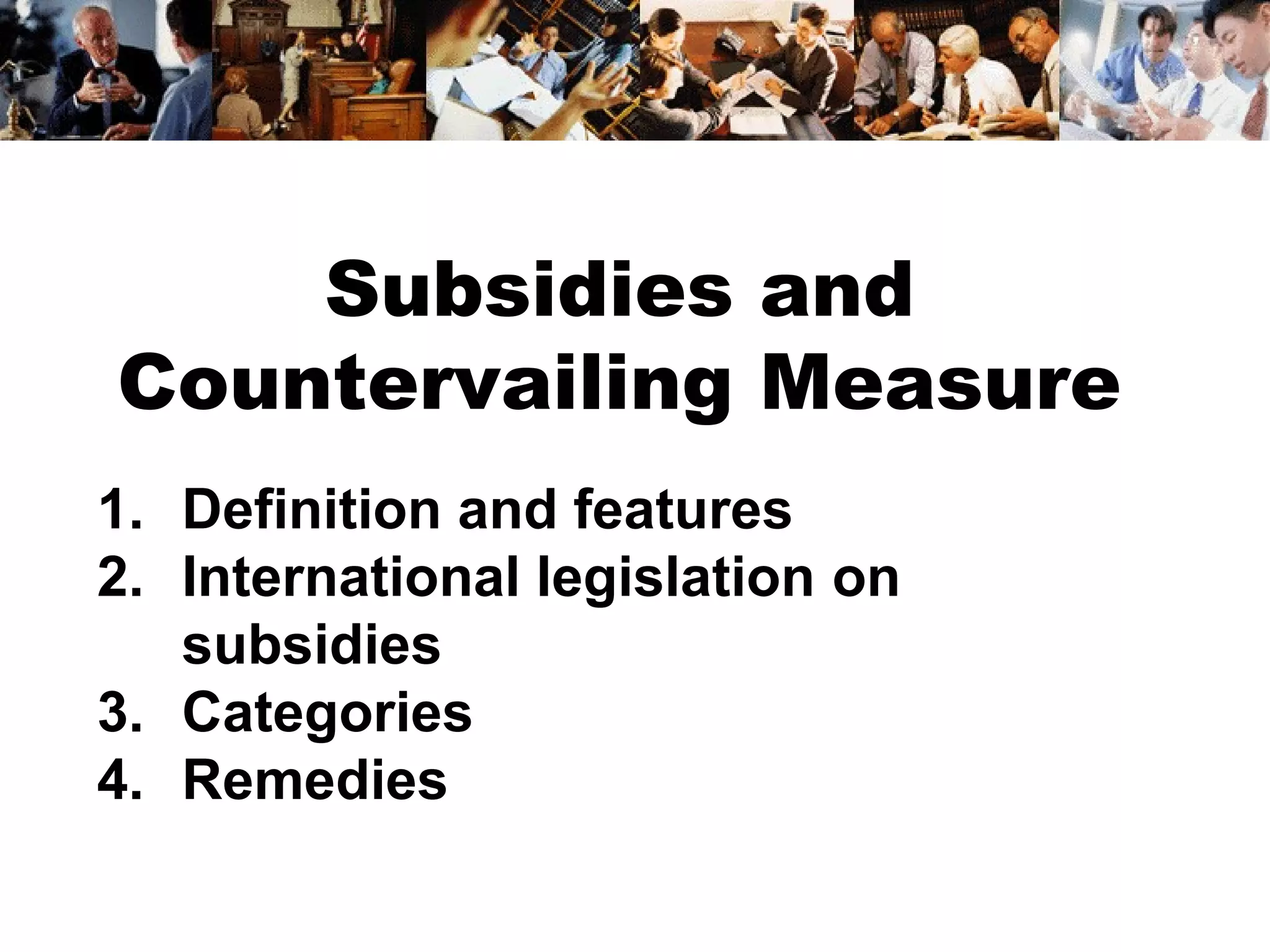 This document discusses subsidies and countervailing measures in international trade. It begins by defining subsidies as monetary support provided by a government or public body to domestic producers or exporters. It then outlines international rules on subsidies from GATT/WTO agreements. Subsidies are categorized as prohibited, actionable, or non-actionable depending on their trade effects. Remedies for different subsidy types include disputes at the WTO or domestic countervailing investigations and duties.