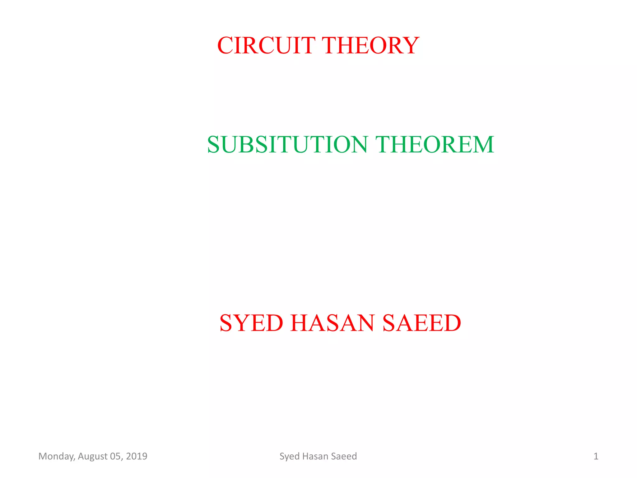 This document discusses the substitution theorem of circuit theory. It states that any branch in a network can be replaced by an independent voltage source without affecting the current through that branch, or by an independent current source without affecting the voltage across that branch. An example network is shown where an impedance Zab is replaced first by a current source and then by a voltage source, leaving the currents and voltages in the rest of the network unchanged. Several reference books on circuit analysis and networks are also listed.