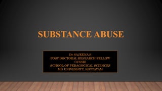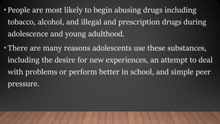- Factors influencing adolescent drug use include availability of drugs, family environment, genetic traits, mental health, and beliefs about drugs. Repeated drug use can lead to addiction and pose serious social and health risks.