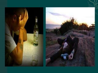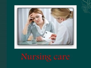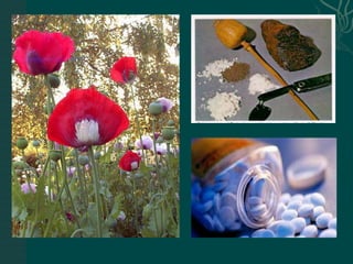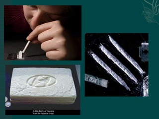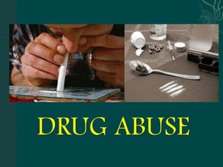 The document discusses substance abuse and addiction. It defines terms like substance, substance abuse, intoxication, withdrawal, tolerance, dependence, and polysubstance abuse. It describes signs and symptoms of use and withdrawal from various substances like alcohol, opioids, cocaine, amphetamines, hallucinogens, marijuana, and nicotine. It discusses treatment approaches including managing overdose, withdrawal symptoms, and long term programs. Nursing considerations are outlined like ensuring a safe environment, supporting the client, and managing risks.